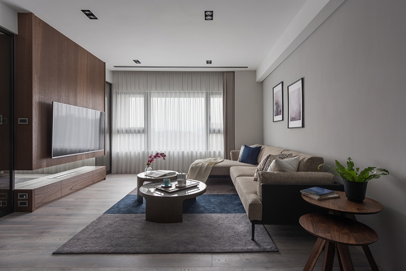 為了創造電影小說文本中的張力與平衡,作家多以二元對立的手法作為相互纏繞的主線,豐富作品的立體度,而在此住家我們亦看見設計師利用相同手法,創造鮮明的住家內涵。推開穩重的門扉,一股窗明几淨的氣息迎面而來;明與暗作為空間中敘事的主體,灑脫與沉穩的色調間,視覺力度得到完美制衡。穿入室內的陽光與低彩度的洗白木地板,織成通透乾淨的光紗質感,搭佐布質沙發、鬆軟抱枕,客廳頓時瀰漫明亮舒適的語彙。在兼具溫柔與活力的敘述方式下,生活的質樸樣貌被緩緩地鋪展開來。