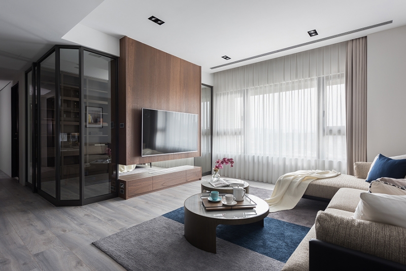 客廳後方的書房區域,以簡約俐落的黑框鑲嵌落地玻璃,鮮明劃分機能區塊之餘,亦阻隔外界音源,並保證了良好通透的視感。映入眼簾的落地書櫃與牆面嵌合,從客廳視角望去既不感壓迫,更達到完善的收納功效,而另一面櫃體則與柱面切齊,打造有助辦公、讀書的安穩齊整環境,在可自由調整光源的風琴簾輔助下,空間得到豐富多變的容貌與氣韻。