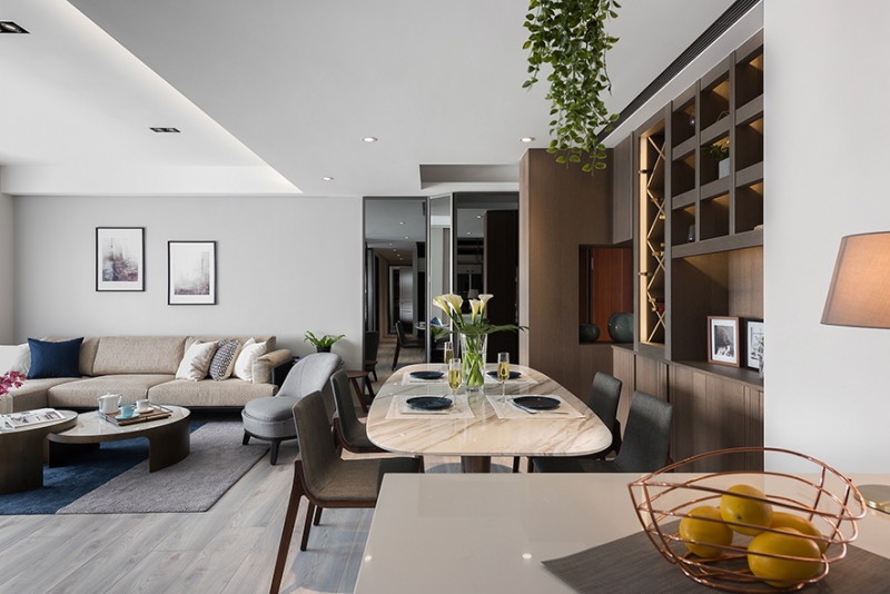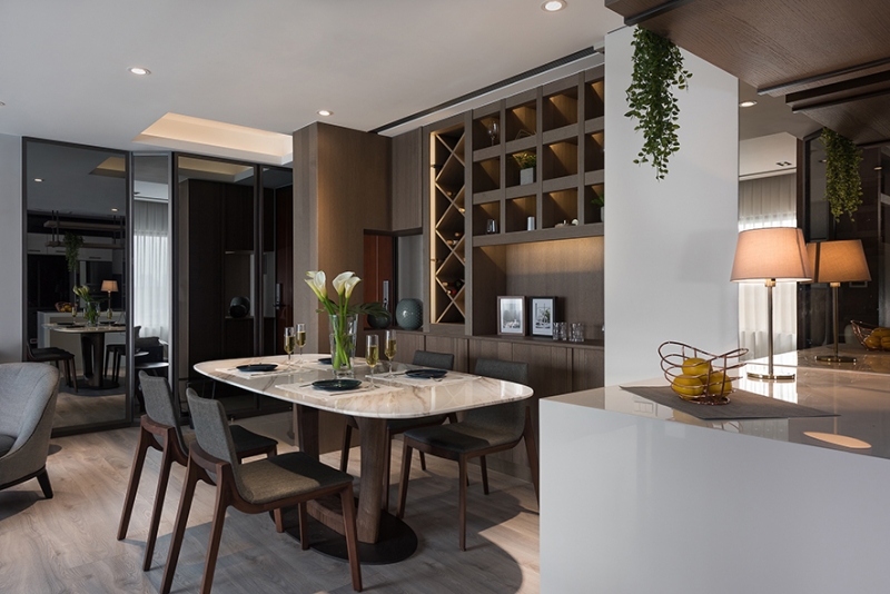 餐廳與客廳比鄰,省去空間藩籬,僅以流暢動線與家具劃分場域機能,使家人間更方便共享休憩與餐食間的相聚時光。菱格與方格併用的餐櫃讓酒瓶及裝飾品各得歸屬;內嵌光源不僅提升櫥櫃整體精緻度,亦增添視覺上的賞玩趣味。餐桌選用卡拉拉白大理石作為基底,與餐廚空間中的晶瑩中島連成一氣,並和後方深木色餐櫃相呼應,呈現明與暗的對比質韻。