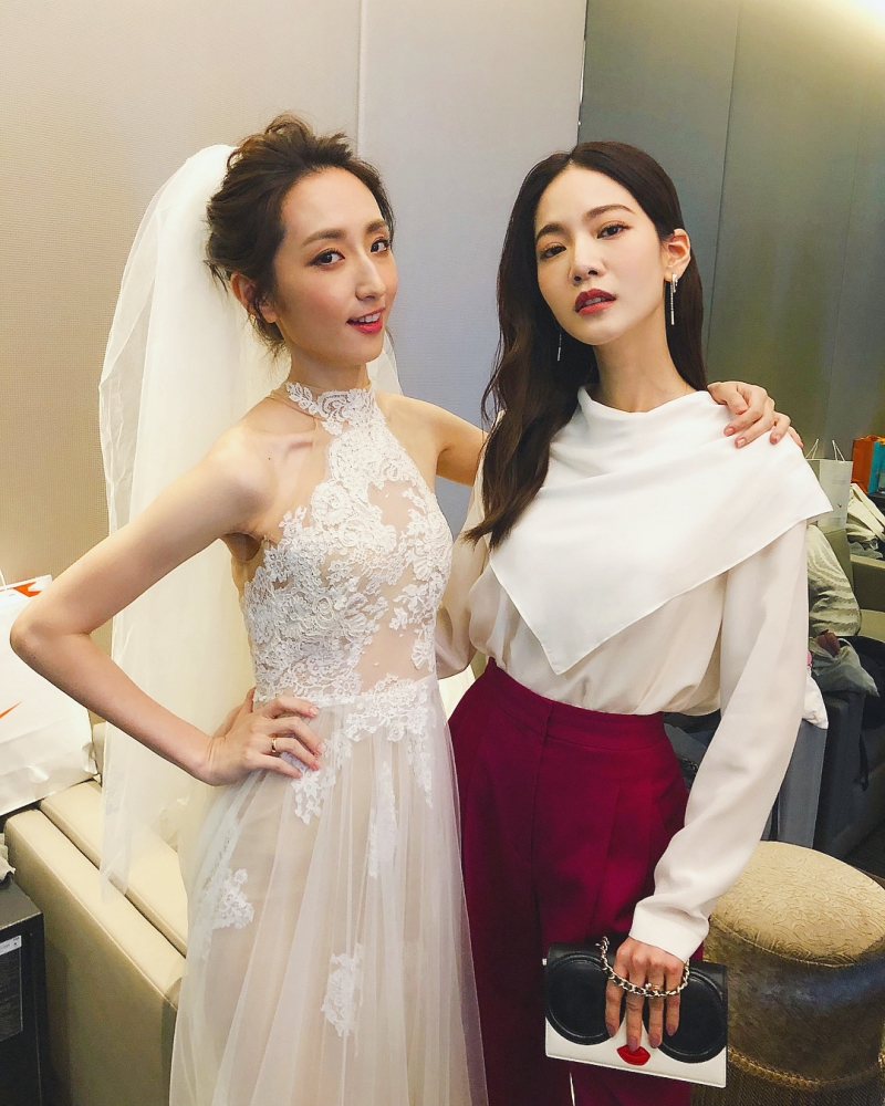 近年大受時尚品牌歡迎的曾之喬,在柯佳嬿與坤達的婚禮上的穿著討論度也極高。上半身小高領的特殊設計白襯衫,搭配高腰的酒紅寬褲,看起來喜氣洋洋、俐落又時尚,手上的 Alice + Olivia手拿包也頗有畫龍點睛的效果。