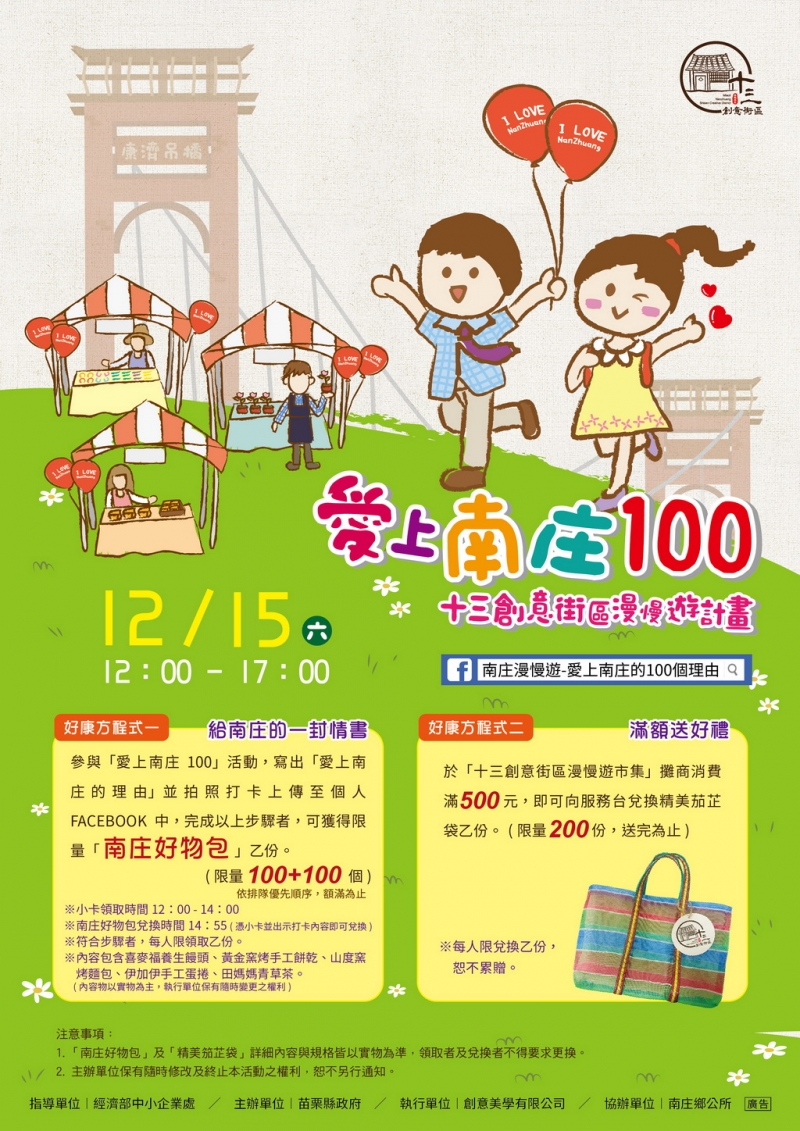 為行銷南庄國際慢城,苗栗縣政府12月15日(六)下午將於南庄十三間老街封街舉辦「愛上南庄100活動」,活動當天民眾可於中午12點至下午2點前往活動現場服務台領取小卡,寫出愛上南庄的理由並拍照上傳至個人Fb,前200位民眾即可免費兌換價值250元『南庄好物包』乙份,好物包內容包含南庄在地知名商品,「數量有限」、「額滿為止」,歡迎民眾踴躍參與,期待大家攜家帶眷前往南庄探索,享受慢城、慢食的悠閒樂趣。