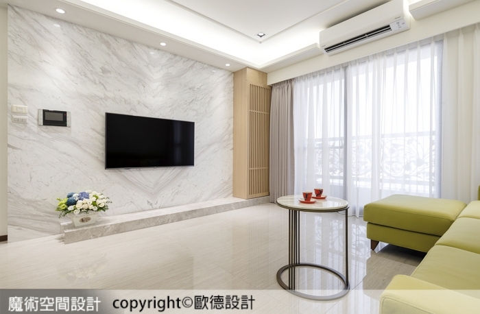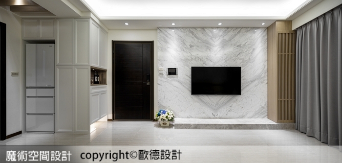1.銀弧大理石電視牆連貫下方安格拉珍珠大理石平台,搭襯拋光石英磚水漾紋路,營造出白系晶瑩通透仙氣十足的居家場域,一跨入家門即可感受滿滿大器正能量的薰陶。