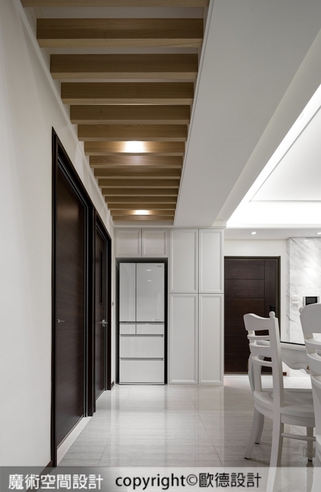 1.進門玄關右側為鞋櫃,連貫轉角另側則為日常雜物收納櫃和冰箱擺置規劃。白色輕古典系統櫃一體成型,俐落大方。