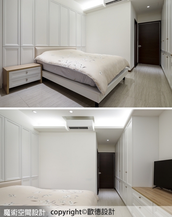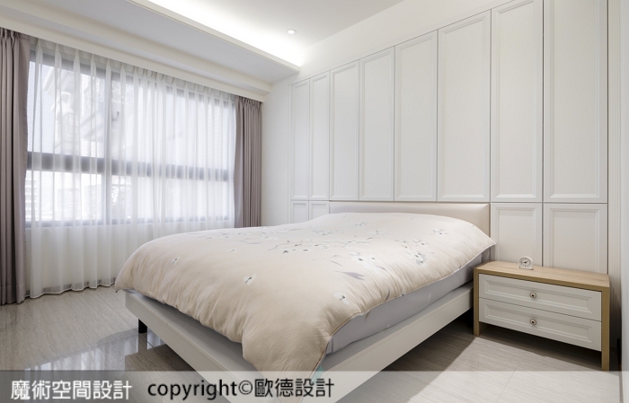 4.主臥室主要訴求大收納,設計師利用床頭大樑下空間規劃整牆面收納空間,以新古典風系統板材營造白系清爽臥室,進口繃布的床頭床板與牆面收納櫃為一體,下掀內部亦為收納空間,配色雅致又舒適。並在主臥以及兩間女兒房都採用屋主精挑細選的歐德奧莉薇亞健康綠色環保床墊和法來伊人體工學枕,打造舒適睡眠。