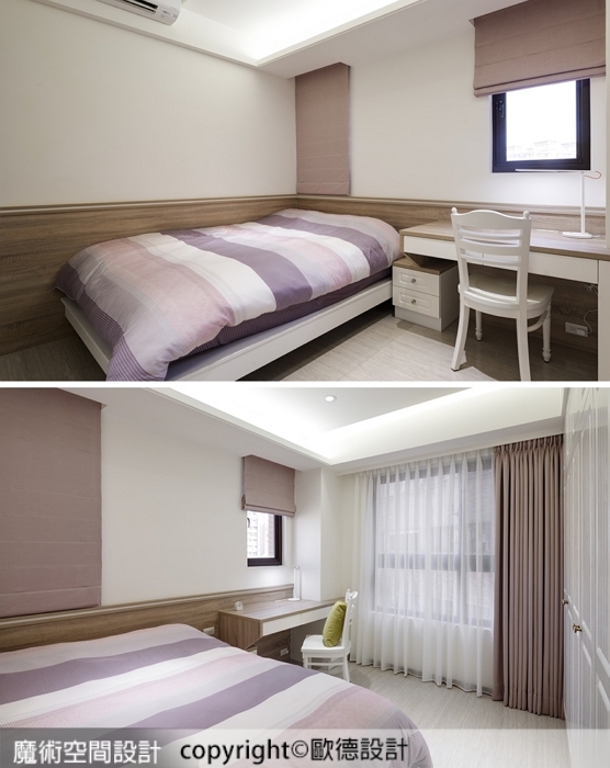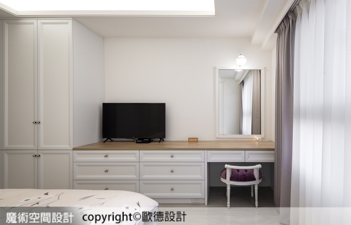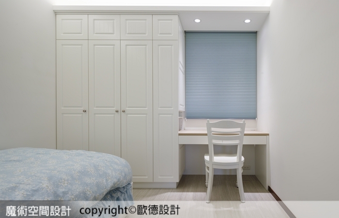 6.小女兒喜歡簡約的米白系鄉村風格,臥室的衣櫃連貫書桌,以白色鄉村風門板線條營造簡約舒適的臥眠空間。
