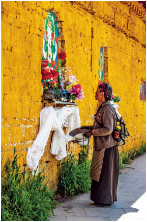 布宮前的經牆上,鑲嵌供奉著菩薩諸佛像,讓虔誠的藏民心有依止,時刻感受佛光普照的溫暖。