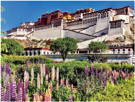 「布達拉宮」前的御花園總是熱情繽紛,在不同季節會開滿不同的花海,這次的春天神殿前開滿魯冰花,更添無限美麗浪漫情調!