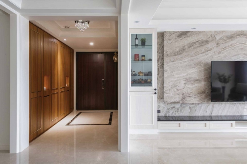 一進門的玄關區相當寬敞,兩側無論是多功能高櫃列或對應的連續面,皆選用色澤較深且溫潤的木質鑲嵌鍍鈦飾條施作,一方面體現主人喜愛低調奢華的新古典風韻,一方面也藉壓深的環境色溫,達到返家後情緒沉澱、舒緩的效果,其中一側點綴著壁燈的造型面,甚至還同步整合了一間男孩房入口,環環相扣的巧思設想十分周到。