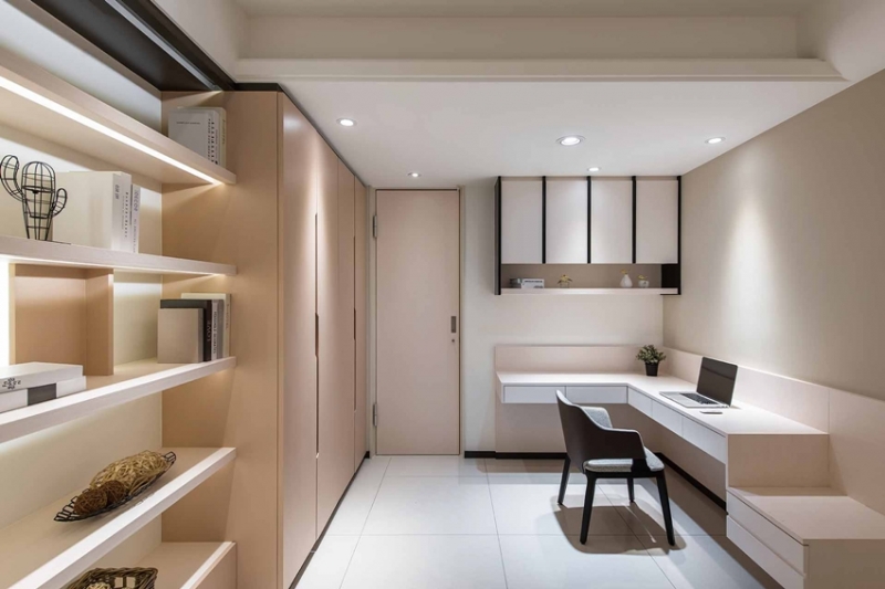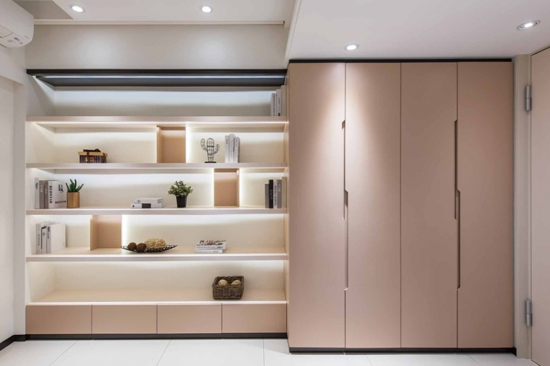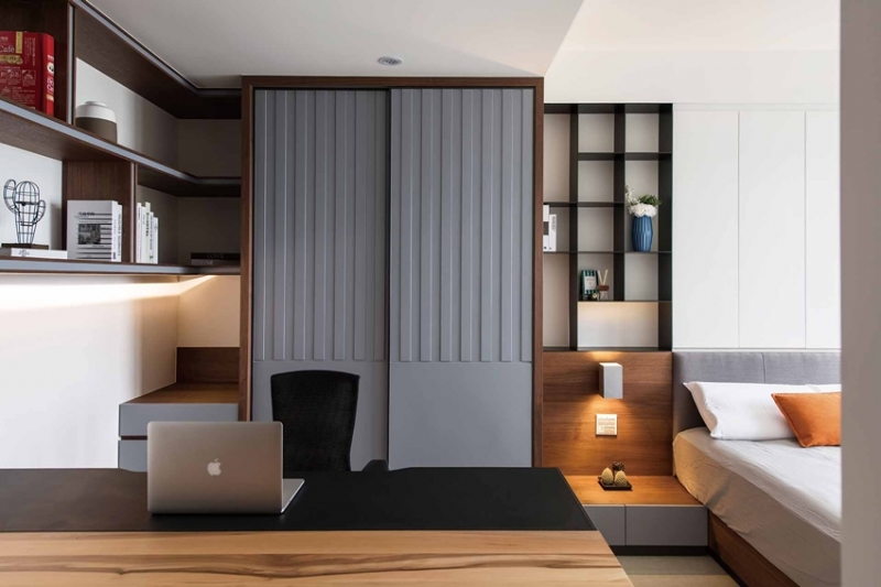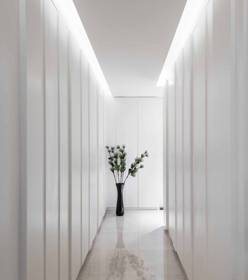 一色純白的中央走道令人印象深刻,無形中也放大了受限的空間感,作為公私領域的連結,設計師首先以兩側溢光的天花板層次,虛化橫亙於此的結構大樑,廊道兩側則以白色線性木作,表現層次鮮明的律動感,而在純淨的立體序列之間,實際上隱藏著數扇房門開口,除了自家人外;訪客幾乎難以分辨,不僅強化隱私性,生活的趣味也隨之而生。