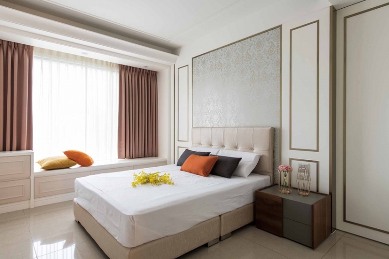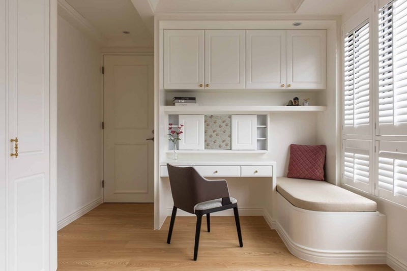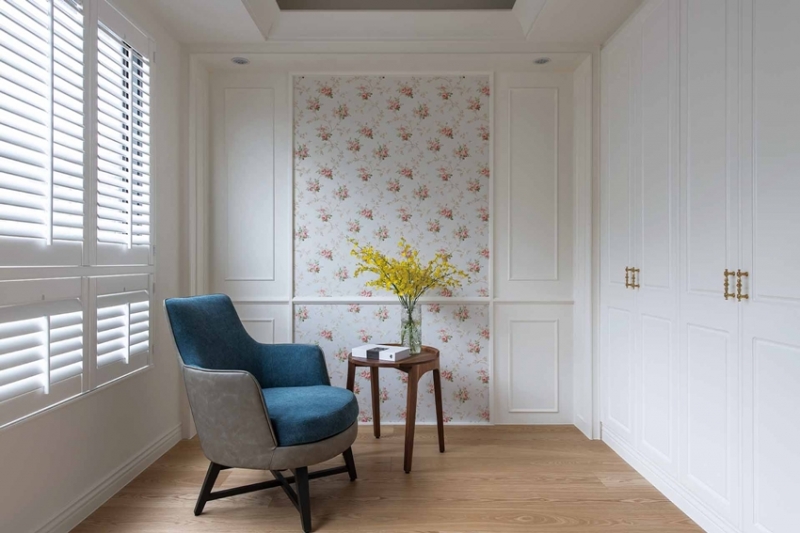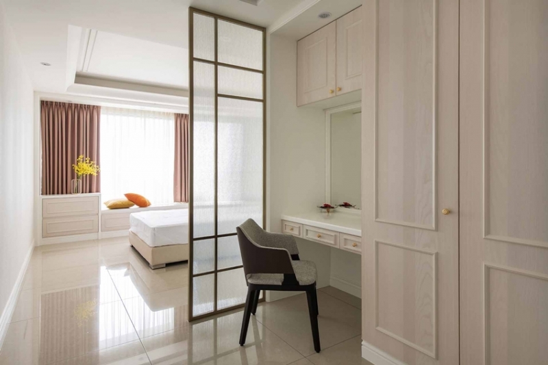 主臥室相當寬敞,以精簡的美式新古典作為風格主題,床頭牆面選用高雅壁紙搭配對稱古典框線,流露放鬆無壓的休憩氣氛,從進門處的置物櫃、梳妝區到睡眠區、更衣室、浴室,多進式銜接的機能單元,演繹備受呵護的寵愛感,窗前並設置舒適休閒臥榻,最適合當作片刻小憩的浪漫場景。女孩房延續細緻柔美的輕古典氛圍,經典碎花圖案醞釀少女心的夢幻,床尾梳妝鏡前並加裝橫拉門,化解鏡子面對床的風水禁忌,檯邊同樣備有精緻的臥榻機能。兩間男孩房洋溢或中性或酷帥的現代魅力,已經成年的大男孩,偏好灰階櫃體加上鐵件格架的爽朗俐落,另一間則是中性裸色調表現間接光與細節質感的細膩,優質的生活品味不言而喻。