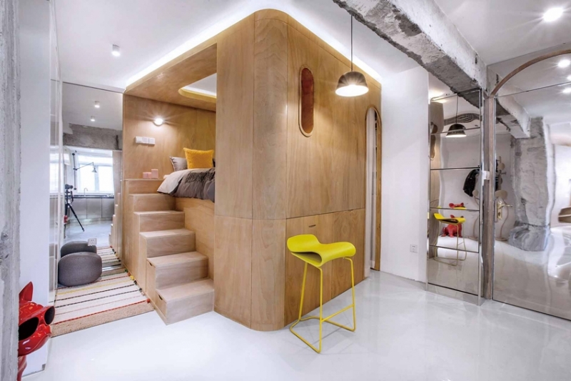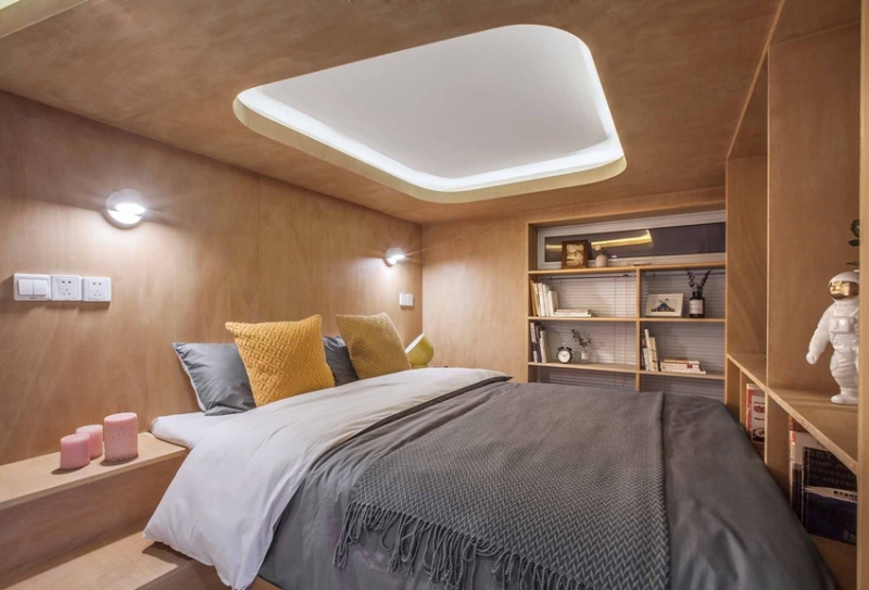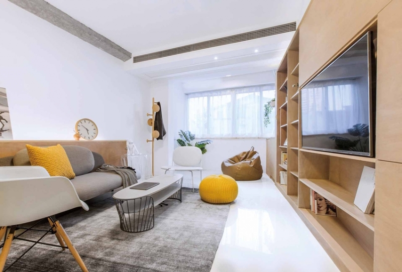 由於坪數較小,除了動線外,設計師也靈活運用簡單卻具有高亮度的色彩及材質,來延伸空間感,由原木、鮮黃、白及灰組構的空間色調,讓介於中段轉折的廚具盒子,以鮮黃打亮視覺,其餘再從抱枕及椅凳等小物作跳色點綴;而鏡面也是設計師拿來拓展空間的元素之一,中國人傳統習慣會忌諱躺在床上就看到鏡中自己的反射,有鑒於此,設計師巧妙將鏡像的反射角度與位置,將其錯落在各牆面,在滿足空間視覺延伸的同時,又避免日常起居時的鏡面干擾。