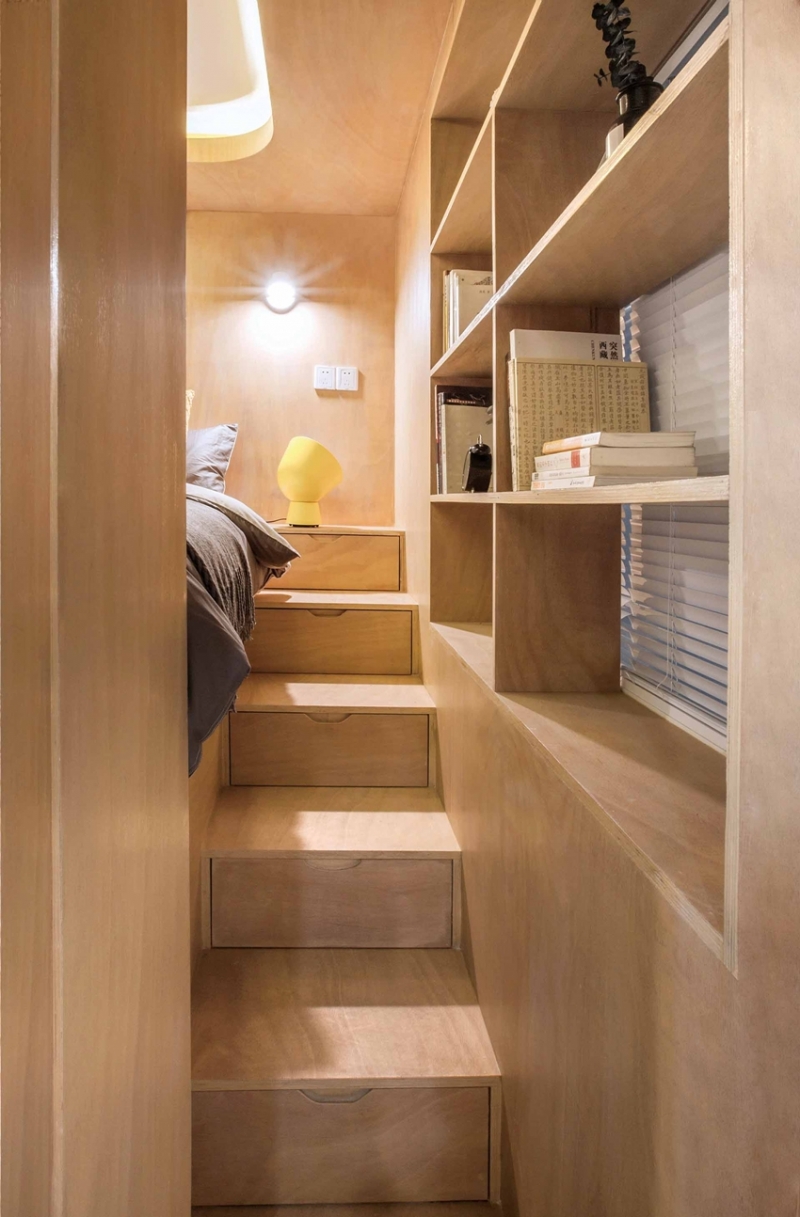 當量體實際被置入後,特別是在娛樂功能塊體部分,明確切割後的立面容易讓動線產生窒礙,因此,設計師決定對原本的設計做出調整,將所有功能體塊整體旋轉10度,如此一來,不僅讓光線及動線的引導更加流暢,同時也創造出一些有趣的空間角落。像是在臥房部分,旁側的夾角剛好能容納上床樓梯,而樓梯恰巧亦能作為暗櫃收納;客廳的夾角則被設計師規劃成三角燈箱,一方面能增添室內情境照明,另一方面也可變成客廳的角落端景或小小展示架。