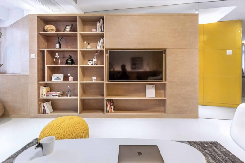 這是一項很有趣的設計概念,把家如同收納心法般,將機能彙整成同一區塊,並將價值折射在空間區位和動線模式之中,妥善放置於公寓內,功能盒與功能盒之間會構成新的活動區域,就能讓空間整齊有序,設計師表示:「當公寓從一個由一間間房子組成的常規形態,變成一個由盒子外連續空間組成的流動空間形態。黃色的廚房櫃體成為整個流動空間的中心。這樣的改變,會讓公寓完全消除了原本的壓抑感,擴大了空間感受。」