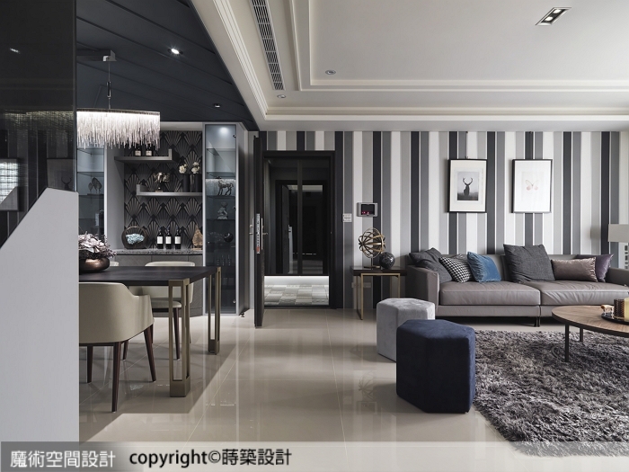 蒔築設計以斜角、條紋、斜線等單純意象,套用於玻璃、鏡面、壁紙等不同材質,激發出豐富多元的幾何流線樣貌,形塑獨特的現代感風格,鋒芒內斂,大器又細膩。