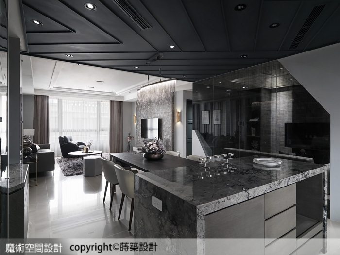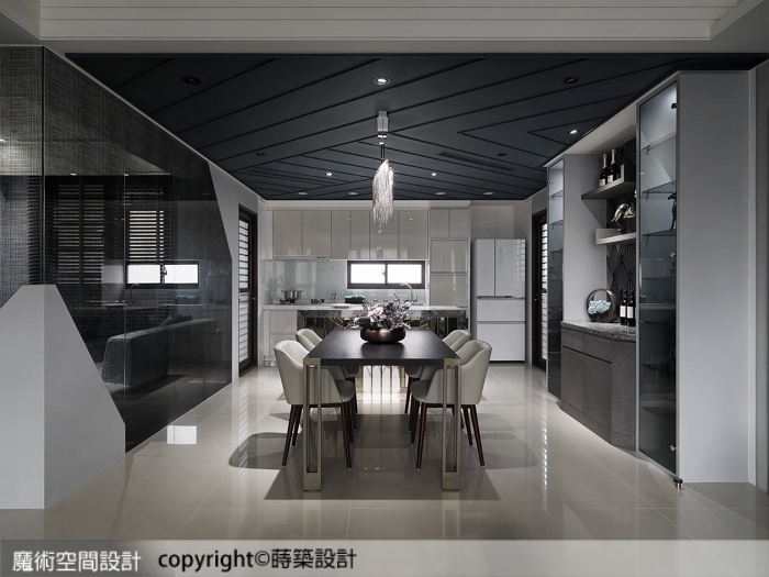 5.餐廚區黑色天花板藉由斜線、夾角線條揮灑出生動視感,呼應視聽室隔間的白色折角造型。