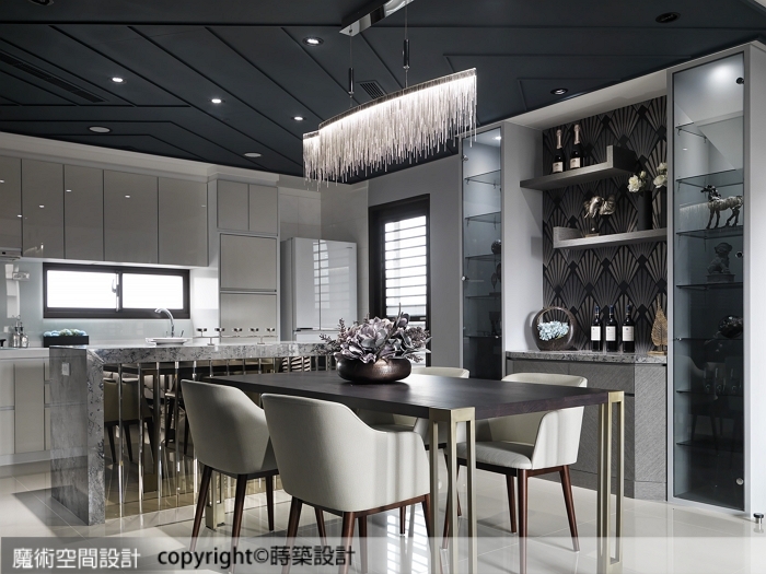 ▲餐廚區以黑白灰色階定調,流瀑造型燈與中島立面的鏡面裝飾,讓內斂灰階閃露鋒芒。