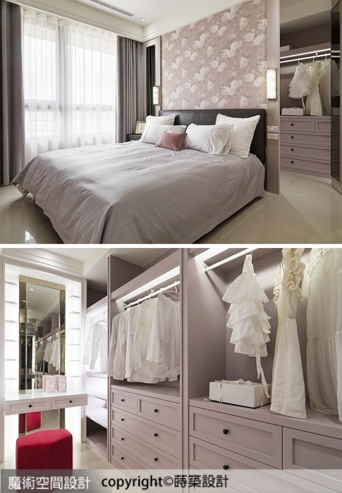 7.主臥運用對稱鏡面裝飾床頭主牆,巧妙隱藏右側更衣室入口,內部以粉色陳列機能、亮麗襲人的燈牆造型梳妝檯,利用有限尺度實現夢幻更衣室。