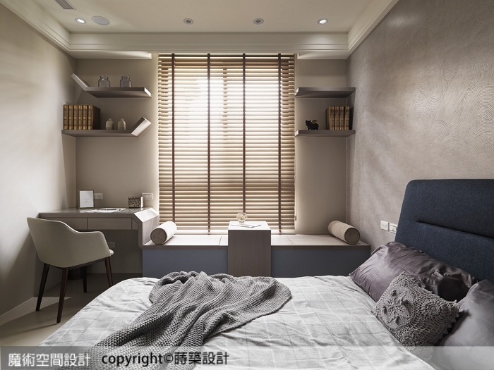 ▲兒子房簡約明朗,窗前規劃休憩臥榻並結合書桌,轉折斜角羅布其間,散發輕快趣味。