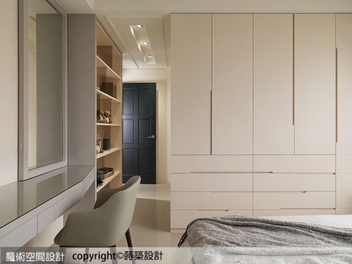 ▲女兒房爭取動線上空間餘裕增加置物層架,書桌與化妝檯整合,並以柔順斜角靠齊置物架。