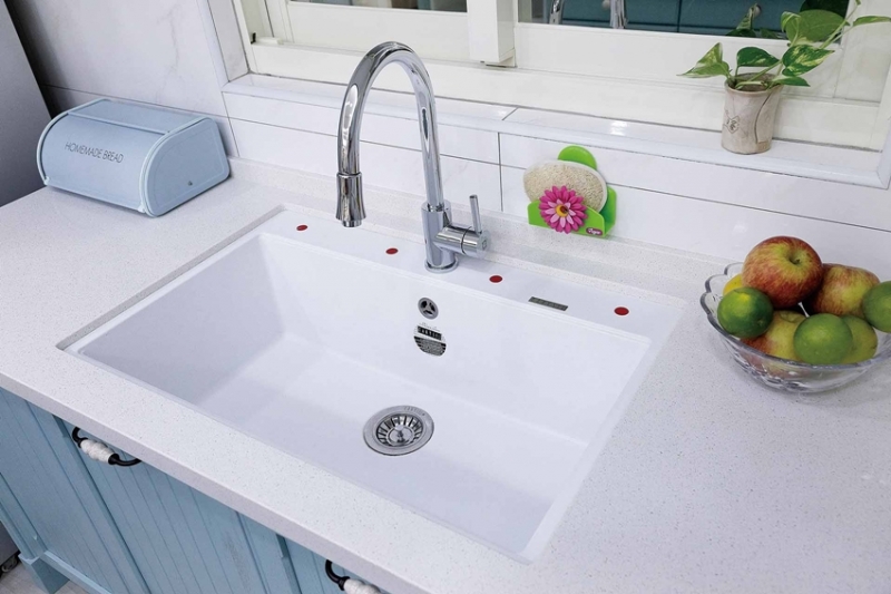 ↑高硬度花崗岩水槽耐磨耐刮,抗菌不易留水漬搭配櫻花石英石檯面成就整體感設計。