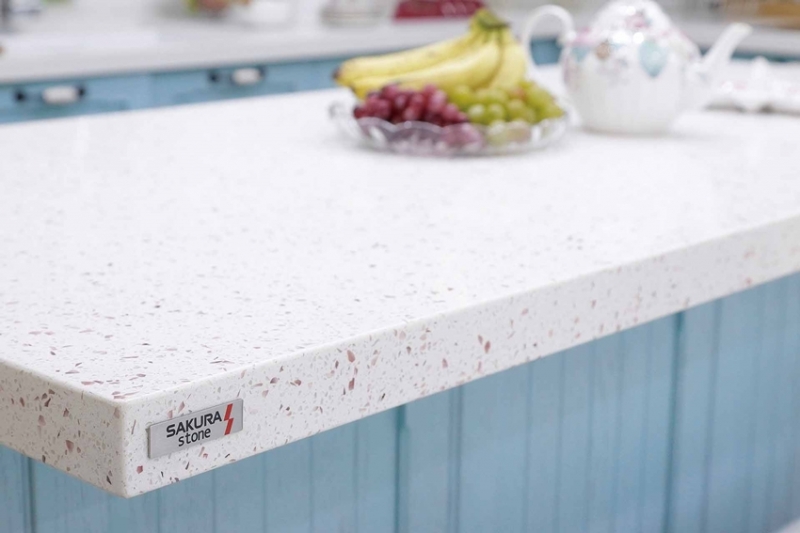 ↑ 紋路有如花瓣灑落的SAKURA stone櫻花石英石檯面,是屋主蘇小姐的最愛。