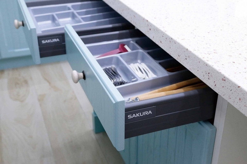 ↑ 餐具收納安裝SAKURA靜音緩衝抽屜,順滑無噪音。
