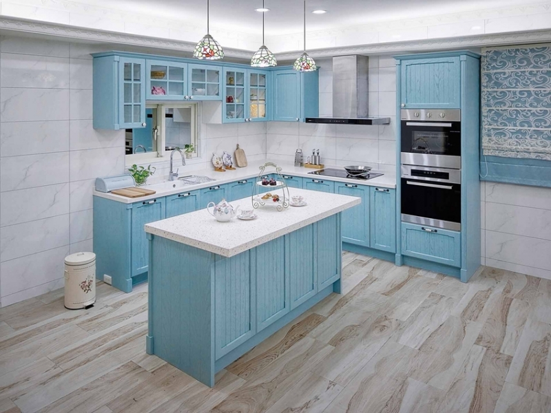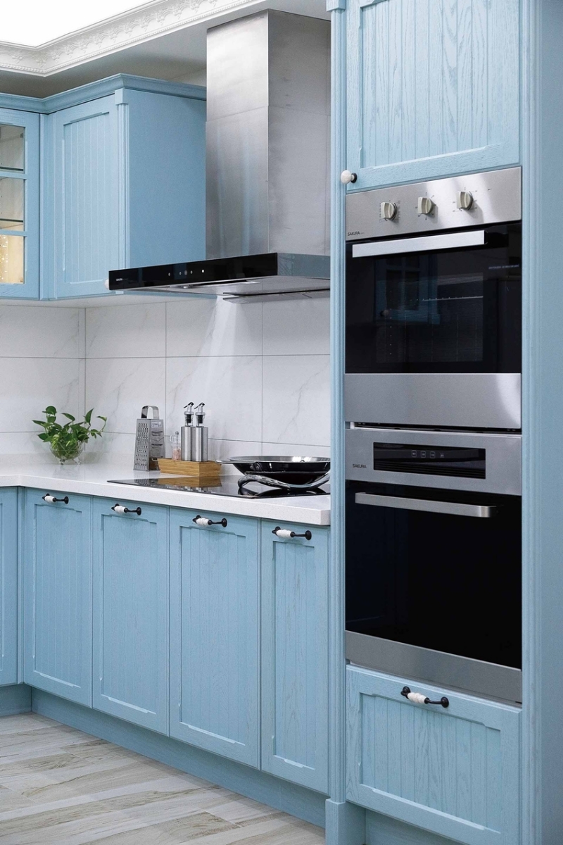 走進蘇小姐的家,改裝後的大房子,最吸引人目光的,就是英國鄉村般的天空藍L型開放式廚房,問起蘇小姐為何想要改裝廚房?她提到因為小孩都長大了,希望能藉由新家廚房,開展家人相處的全新關係,讓廚房能夠從家中原本只是在烹煮料理的配角,可以變成凝聚家人情感的生活重心,為此,她在林口住家附近看了不少廚具店,除了國產更有進口廚具品牌,甚至還請人來丈量過,不過卻因為沒有具體畫面,始終都沒找到滿意的,直到有一天去南崁銀行的路上,看到櫻花廚藝生活館的展示空間,她一眼就被那櫻花色的檯面給吸引,於是,蘇小姐知道她找到夢想中的廚具了。