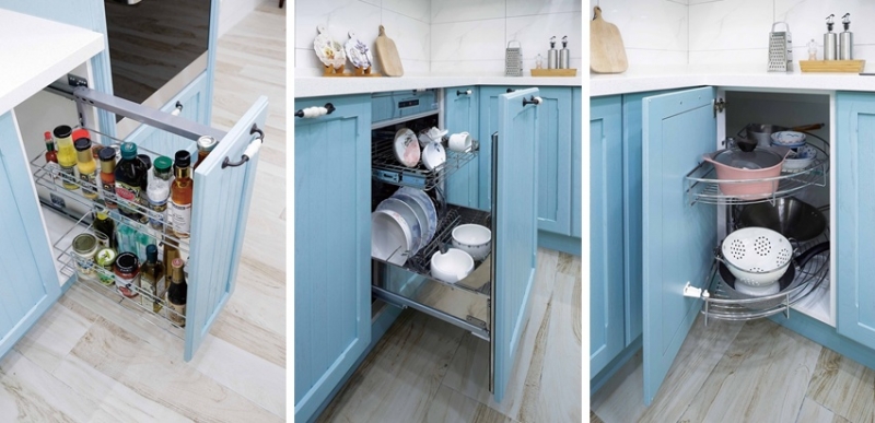 ↑左圖-烹飪區右側規劃緩衝不鏽鋼側拉籃地櫃,醬料瓶罐便利收納維持廚房整齊美觀。.中圖-洗滌區右側配置嵌門板殺菌烘碗機,洗完碗能夠順手把碗盤直接放入烘乾。右圖-180度不鏽鋼轉盤地櫃,聰明運用轉角空間收納大型鍋具、碗盤。