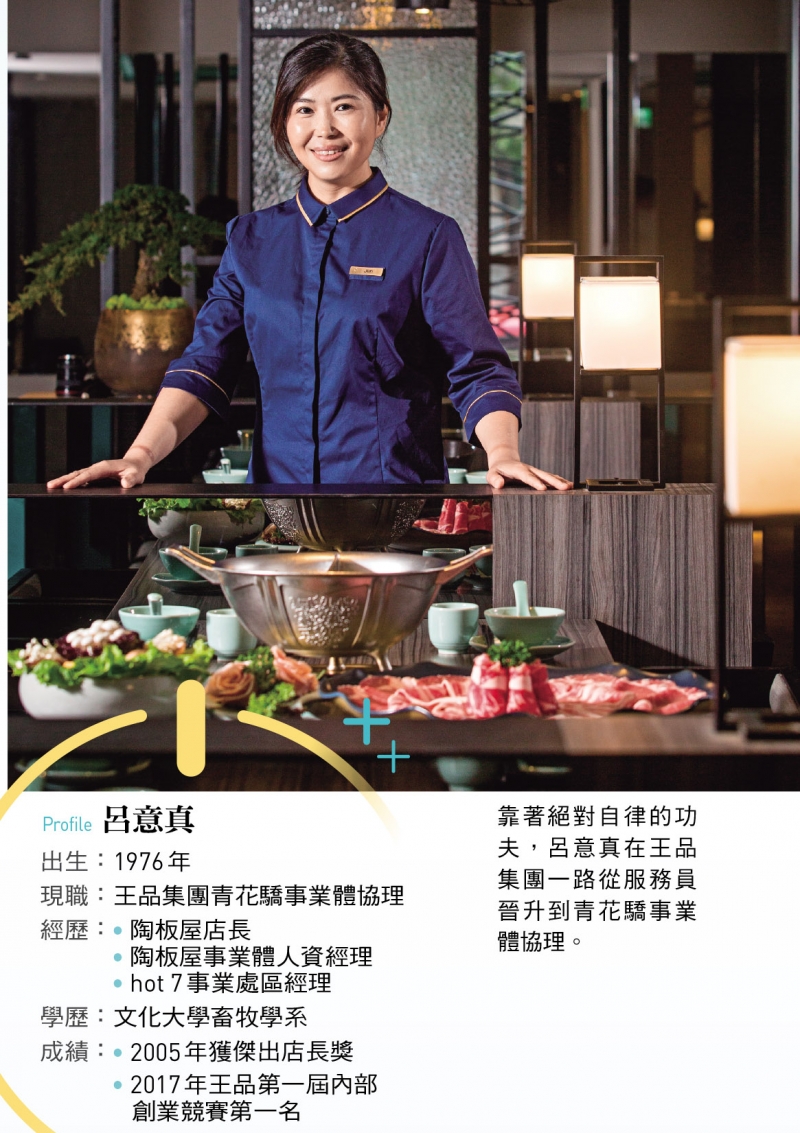 台灣餐飲業龍頭王品集團創立25年,事業處最高主管共有6位拿過台灣連鎖暨加盟協會(TCFA)「傑出店長獎」,呂意真就是其中一位。王品目前在兩岸共有23個自創品牌,呂意真也榮列第22個內部創業品牌的首任專業經理人,偕同夥伴打造出「青花驕麻辣鍋」。