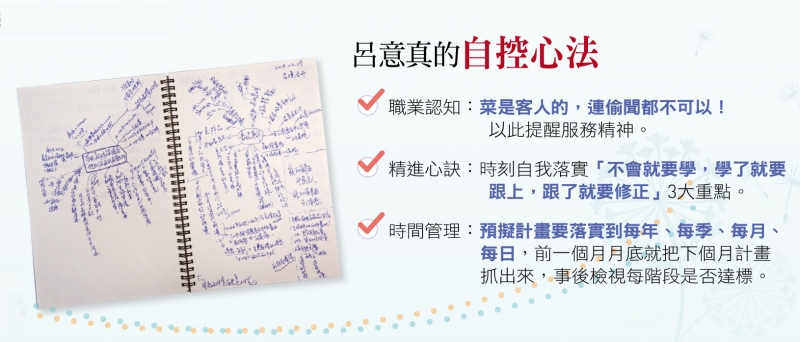 「用餐尖峰時段,每個人都很忙,如果犯錯,就一定要道歉,因為道歉的收穫不在別人,而在於自己,可以學習到下次不會再輕易犯錯。」呂意真說,這是她在上班第一年就學到的功課,從此她也展開「學、跟、修」的修練之路。