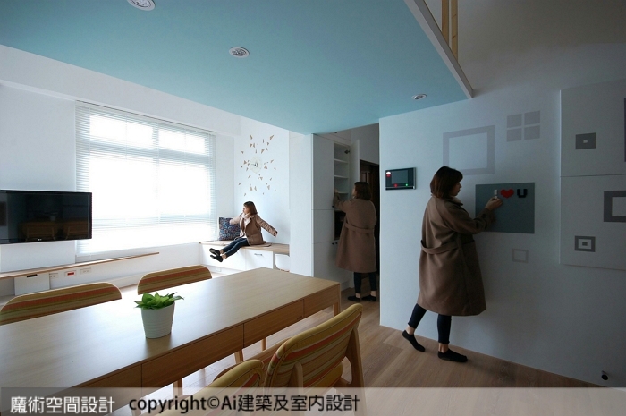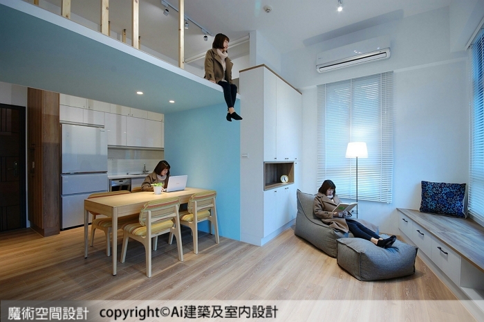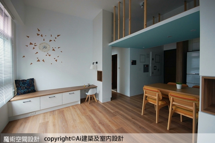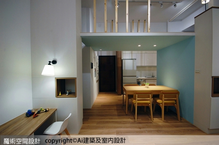 Ai建築及室內設計跳脫傳統夾層規劃,在合於法規、安全、穩固的前提下,以鳥瞰平台的概念,開創水平面以外的空間感,讓活動、對話、想像、儲物等虛實需求,往垂直向度延展。