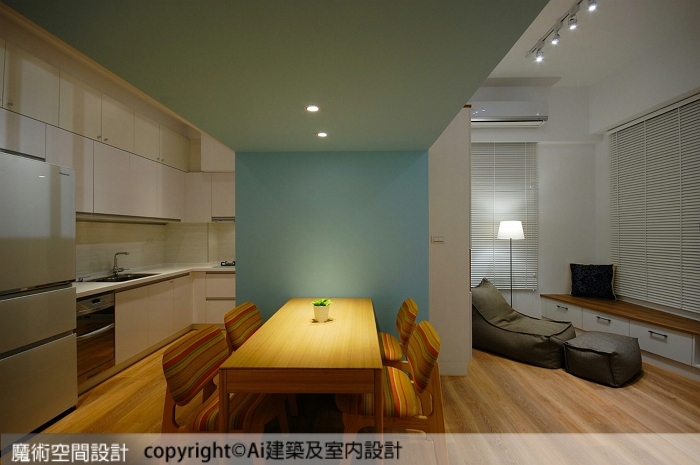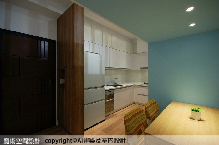▲餐廚區域增設防火的矽酸鈣板隔牆,電器櫃與廚房仍屬連貫場域,用餐區則有所區隔。