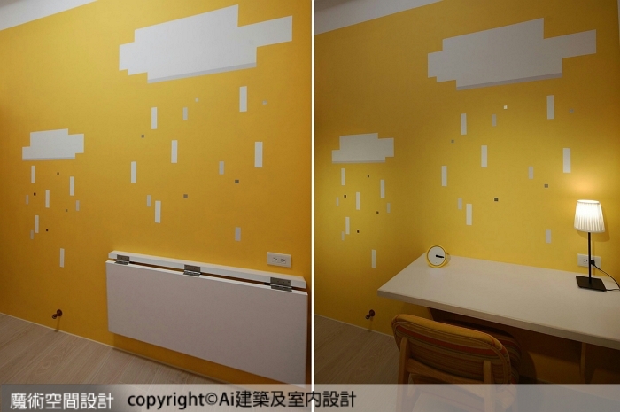 7.以明亮色調彩繪雲雨動態的小孩房,設計壁掛摺疊式書桌搭配下掀床箱,兩者收放自如,爭取更大活動空間,讓小孩房活潑感與高效益兼具。