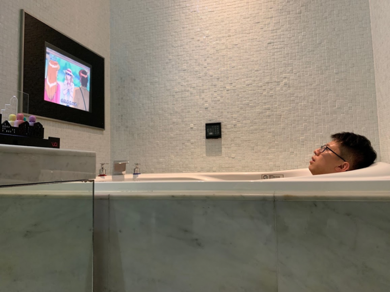 泡澡囉!還可以邊泡澡邊看電視,電視上播著烏龍派出所,哦哦哦!