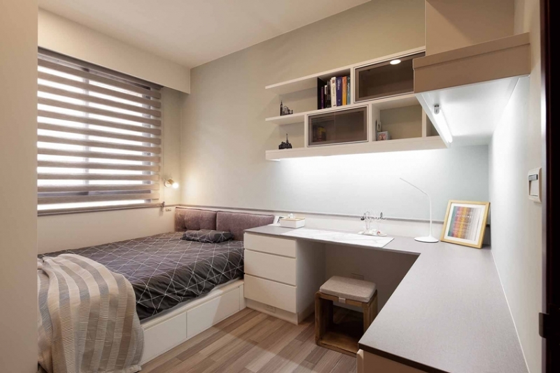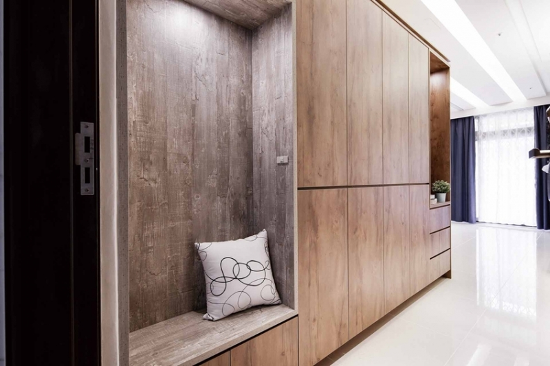 謝設計師有層次感的規劃收納系統櫃,利用玄關隔間牆、餐廳櫃、更衣室與隱藏式設計將收納櫃體化於無形,突顯出居家空間的整體設計美感。乾淨整齊的家,毋庸置疑是塑造美感的第一步。玄關隔間牆的櫃體美背設計,以凹凸面與線條感加以美化,成為牆面的一部分更具整體感。餐廳靠牆面設計一座收納櫃,提供收納餐廳各式用具的方便性。更衣室設計成為現代居家不可或缺的一環,鐵件與系統櫃的搭配使用與完整規劃,讓人能夠聰明進行整理歸位,衣物用品有條有理地放置,居家生活有條不紊更加有序。女孩房裡的利用床下和床尾空間將收納發揮到極致,釋放出完整的活動區塊,提供居住者一個放鬆的居家環境。