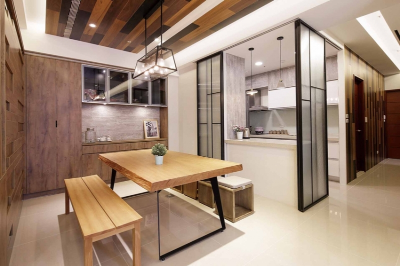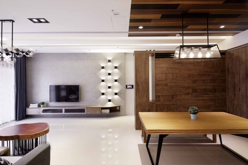 客廳與餐廳的穿透式設計無隔間的阻礙更加一氣呵成,開放式廚房透過拉門設計,在烹調時可以將拉門關起來,避免廚房油煙四處散逸,這一座拉門兼具風格塑造與功能性,視需要調整開或關,讓人在廚房忙著準備餐食時,得以與其他空間的家人產生互動,更具親密感。屋主對於工業風傢俱的喜愛表現在燈具的選用,各式燈具畫龍點睛的點綴,尤其是位於電視牆菱格錯落排列的燈具,點綴漸層散發光影,使清水模牆不至於如此冰冷,成為空間中的視覺焦點,增添表情與變化,也為居家生活增加溫暖調性。木紋柔軟溫和的線條,與冷硬的工業風線條形成對比,居家美學風格獨具。