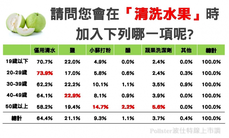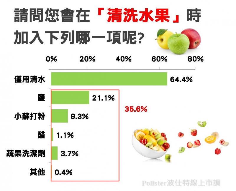 Pollster波仕特線上市調網詢問「請問您會在『清洗水果』時加入下列哪一項呢?」。調查結果顯示,最多受訪者「僅用清水」來清洗水果,占整體比例64.4%,其次依序為「鹽」(21.1%)、「小蘇打粉」(9.3%)、「蔬果洗潔劑」(3.7%)、「醋」(1.1%)與「其他」(0.4%)。整體而言,逾六成民眾(64.4%)僅用清水清洗水果;而逾三成(35.6%)民眾則會另外加入其他輔助品加強水果洗淨,其中以鹽的比例最高。