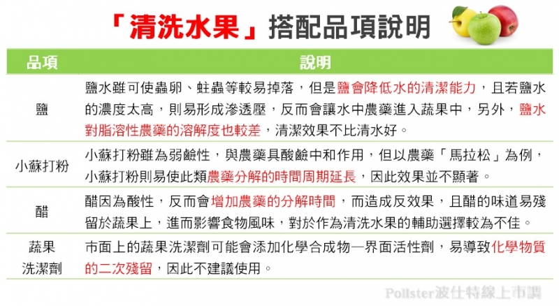 而究竟「鹽」、「小蘇打粉」、「醋」及「蔬果洗潔劑」能否有效洗淨水果表皮上的殘留物呢?詳見下表說明。
