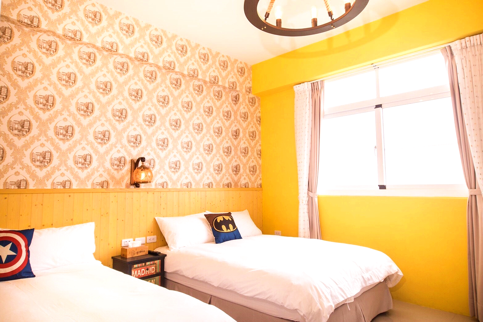 DC與漫威元素的抱枕、鵝黃色的牆面帶給人熱血年輕之感!加上大大的窗戶,這間也是很多年輕人的愛唷!