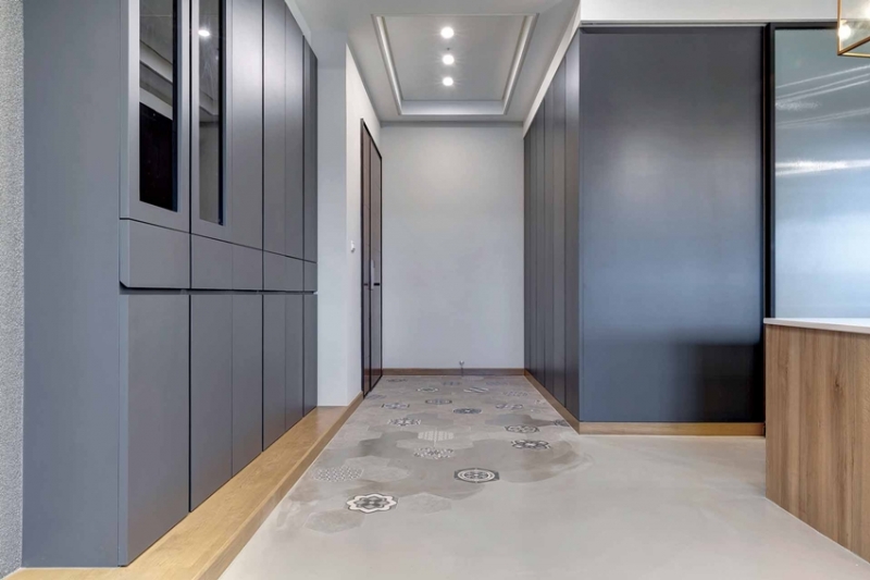 為了讓寶貴空間獲得最佳利用與維持開闊感,彭思嘉設計師首先根據屋主需求,重新斟酌公領域的機能分配,首先借獨立廚房新砌的九十度隔間線,為玄關增設一座置物超高櫃,櫃體採雙面可用設計,一半輔助與大門同向的高櫃列,一半則擴充為廚房內使用的家電櫃,而廚房隔間、高櫃均以屋主喜愛的灰階-鐵灰色烤漆施作,穿插淺木色把手線條,一方面增加量體的活潑層次,同時也提升細節的精緻度。當廚房面寬、開口一旦確定後,平時招待三五好友不可或缺的大型中島隨之定位,這座量身定製的機能量體,擁有站姿、坐姿皆宜的高低檯面,並兼具水槽、收納等多用途,多人聚餐時還等於是餐桌的延伸,當然也是平時在家休閒的絕佳地點,而包含廚房、中島軸線在內的機能增列,無形中也讓公領域的單元配置更為完善和諧。
