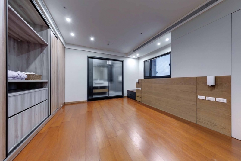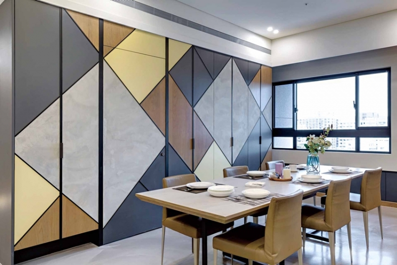屋高可達三米四,這點在新建住宅中甚是難能可貴,不過寬敞的開放空間,難免會有交叉橫亙的大樑壓迫視線,於是設計師在客廳上方打造邊緣斜切的分區天花板,搭配間接光的烘托,極大化地展現先天優越的屋高。客廳明亮大度,電視牆面使用的石頭漆質地樸雅,迎合主人的低調務實,除了房間外全區地面皆以特殊塗料鋪設,恬靜淺灰色調加上無接縫的緻密,也有延展景深的積極效果。做為餐廳背景的幾何色塊造型堪稱全案一大亮點,精選烤漆、樂土、實木皮等多種媒材幾何拼接,並鑲嵌金屬飾條增加立體感,除了內建大容量的收納高櫃,同時也巧妙將主臥房門一併整合。儘管整間屋子平面上看似方正,但由於結構樑內縮,所以空間多處皆有畸零凹凸,最明顯的位置就在主臥,設計師為爭取床頭牆面的完整與安穩,利用半高的木質飾版拉出大面寬,左側後方的小區塊結合架高地板,成為一方隱密舒適的小憩區,右邊的凹區直接封門整平,讓臥室裡多了一間實用儲藏室。主浴的佈局尤其精彩,原本過大的空間切出部分增設一間獨立客廁,接著另砌一面牆加上雙地材高低差,劃分乾、濕區並以機能層次、轉折動線,大大提升使用者的禮遇感,種種縝密又貼心的設想,著實讓屋主稱讚不已呢!