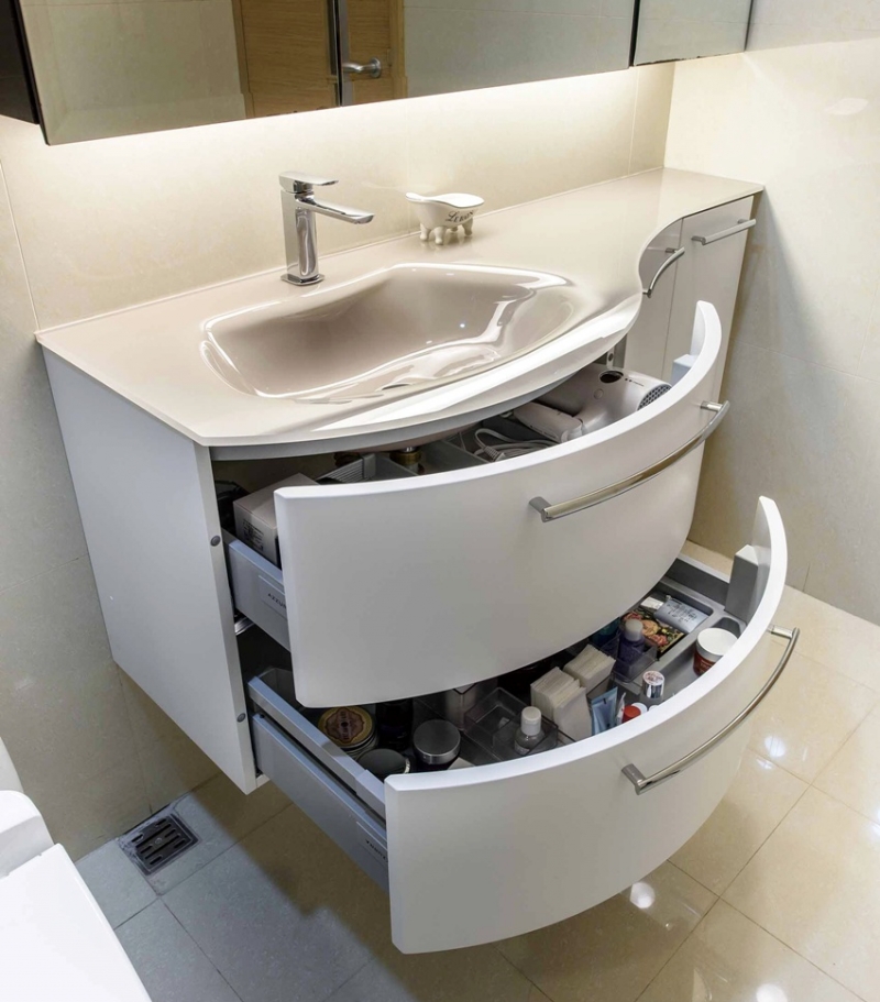 弧形的抽屜外觀別出心裁,拉開後會發現抽屜中間還貼心留出水管經過的縫隙,以便後端的深度也能善加使用。