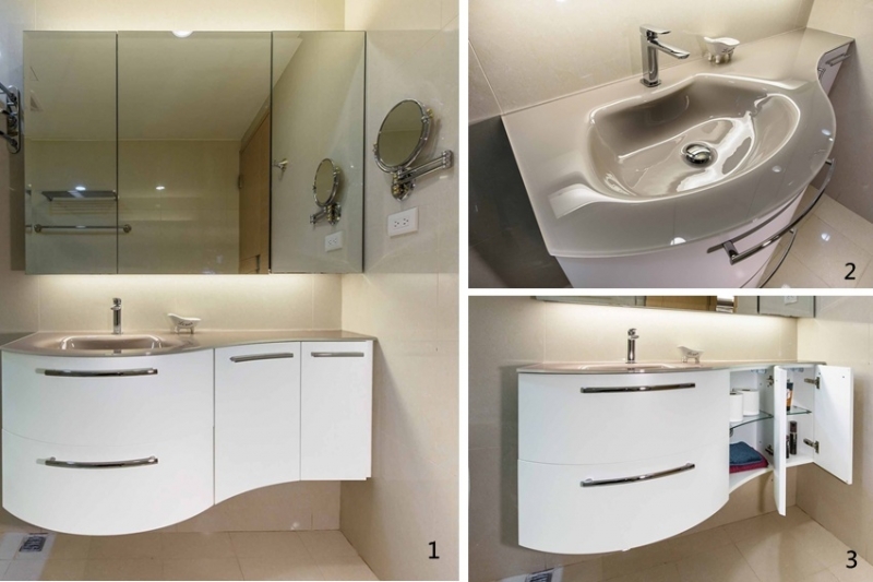 - 一體成型的玻璃檯面,加上白色烤漆的弧線櫃