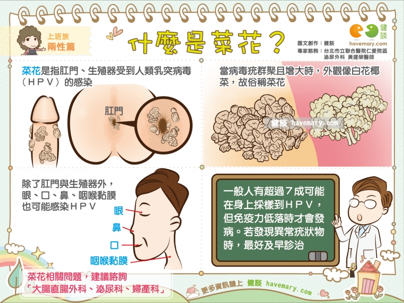 菜花,是指肛門、生殖器受到人類乳突病毒 (HPV) 的感染所致,統稱為病毒疣。