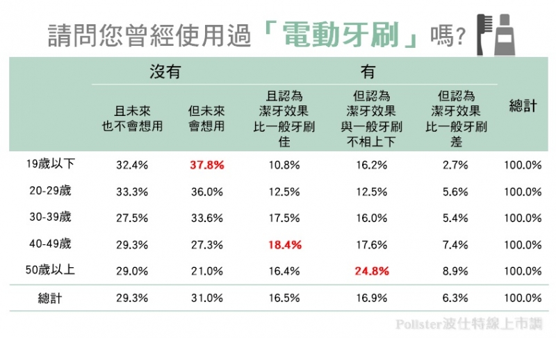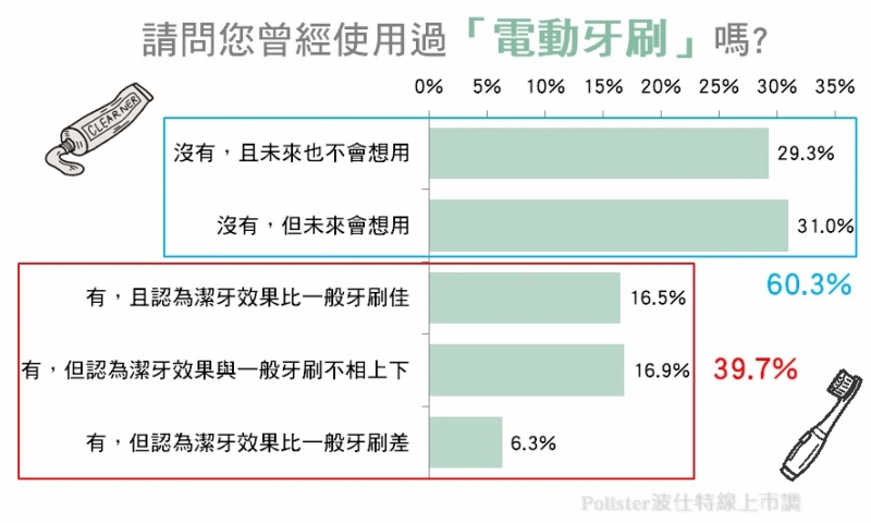 Pollster波仕特線上市調網詢問「請問您曾經使用過『電動牙刷』嗎?」調查結果顯示,最多受訪者表示「沒有,但未來會想用」,占整體比例31.0%,其次依序為「沒有,且未來也不會想用」(29.3%)、「有,但認為潔牙效果與一般牙刷不相上下」(16.9%)、「有,且認為潔牙效果比一般牙刷佳」(16.5%)以及「有,但認為潔牙效果比一般牙刷差」(6.3%)。
