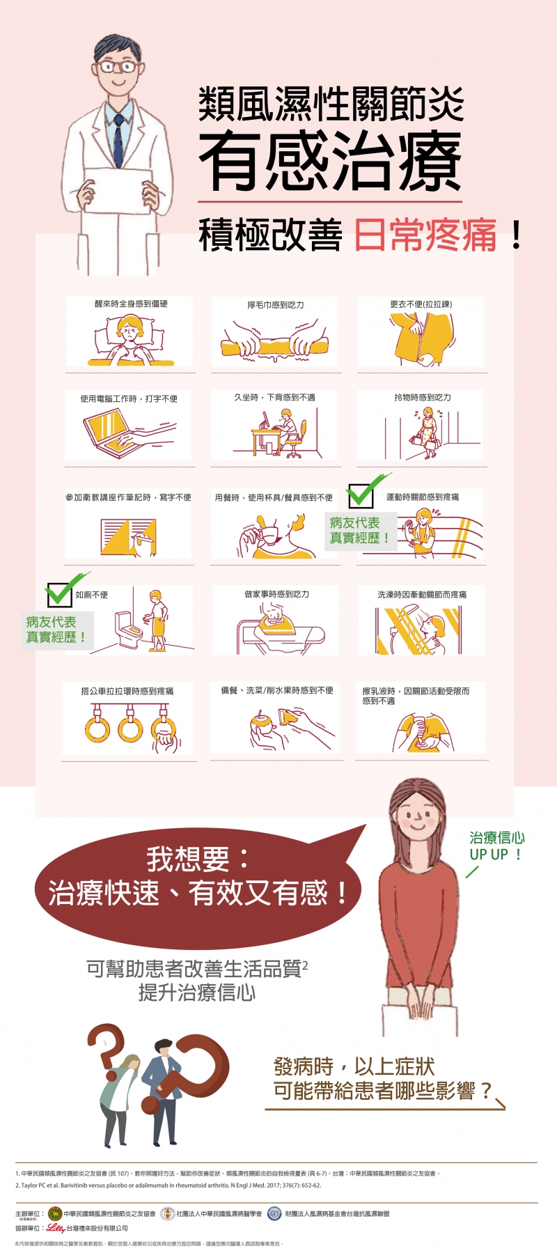 對此,國內三大類風濕性關節炎醫病團體,包括:類風濕性關節炎之友協會、風濕病醫學會和風濕病基金會同聲提醒,患者應正視自己的感受,與醫師討論後透過快速且有效的「有感治療」,以提升生活品質,並且達成良好的疾病控制目標。