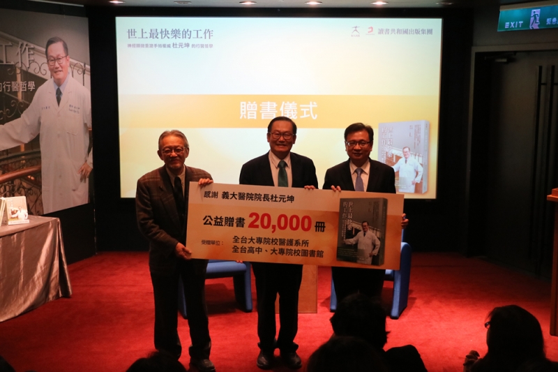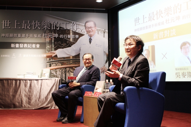 今日(1/16)下午二點半在誠品書店敦南店舉辦《世上最快樂的工作》新書發表記者會,醫界貴賓雲集。臺北醫學大學校長林建煌蒞臨現場致詞,感謝杜元坤致力奉獻、回饋母校,培育高階醫療人才、臨床研究計畫、北醫橄欖球隊發展等基金,能有這麼一位傑出校友,是北醫的幸運。臺北醫學大學董事李祖德也特別蒞臨分享:杜元坤院長可說是「非典型」醫師的代表,兼具極高的醫學專業與熱情。不論是醫學教育的推動、病人關懷的重視、無私的人生態度,都令他印象深刻。