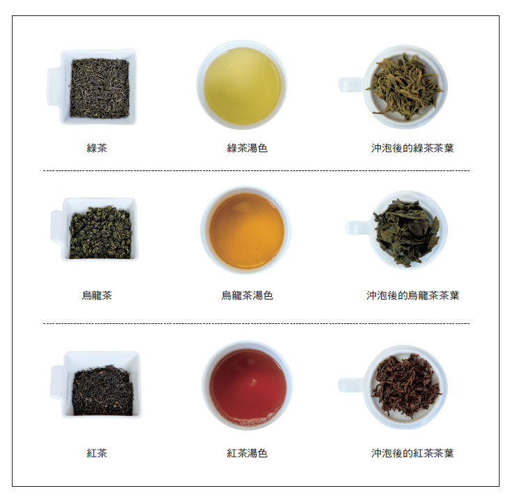依照製茶工序的差異,大致上可以分為綠茶、烏龍茶、紅茶三種。為什麼使用同樣的山茶科植物,卻能做出味道和香氣都截然不同的三種茶品?這其中差異就在於製茶過程中的發酵程度。