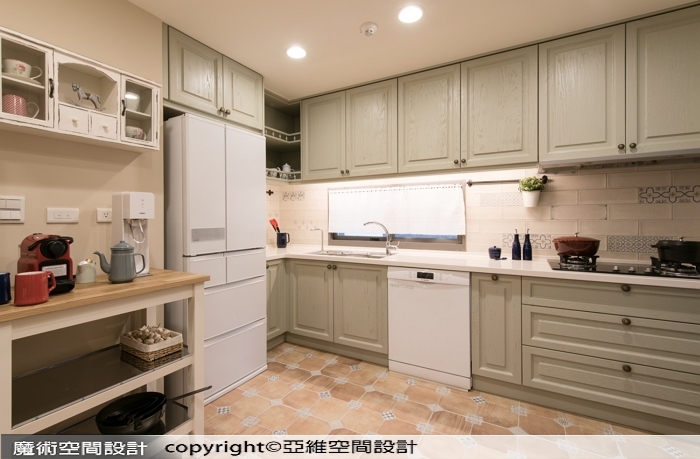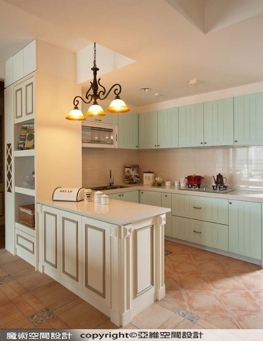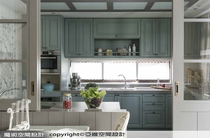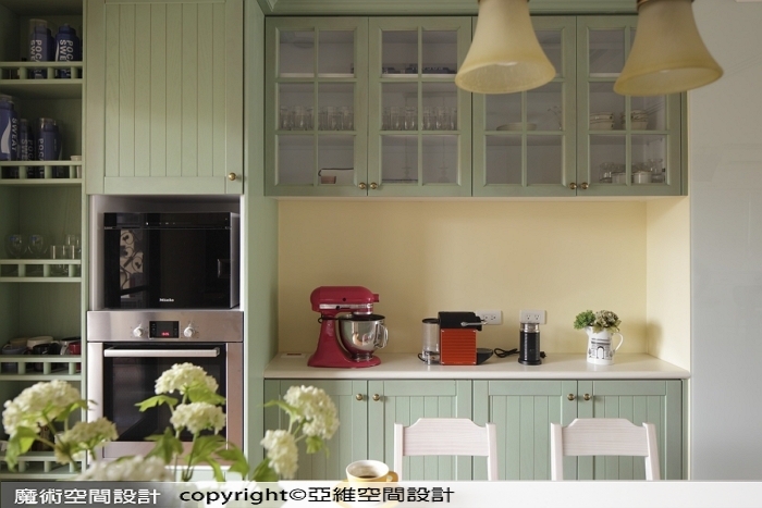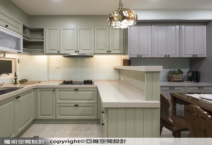 ▲鄉村風廚房以粉綠櫥櫃帶出輕盈感,中島與電器櫃整合,配上造型吊燈,更添溫馨氣息。