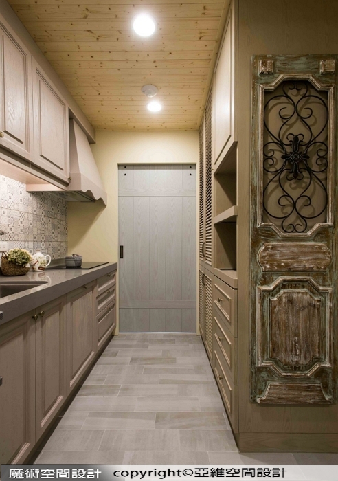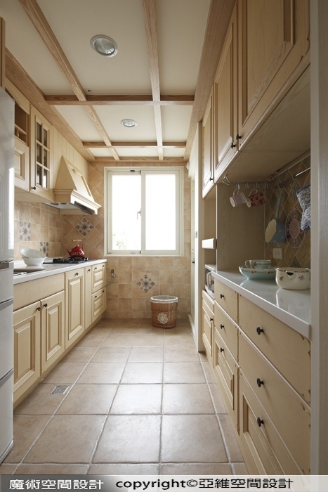 ▲鵝黃色的門板與美麗壁磚,還有天花裝飾木架,清新氣質改變了長條狀廚房容易狹迫的印象。